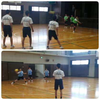 実際にドッジボールのゲームをしながら、審判、進行、得点などの確認を行っていました。