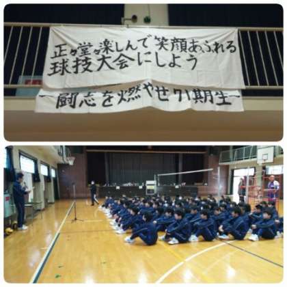 「正々堂々楽しんで笑顔あふれる球技大会にしよう 闘志を燃やせ71期生」と書かれた横断幕のもと、1組・佐々木君から開会の挨拶がありました。次に、2組の尾西君・笠岡さんが選手宣誓を行い、続いて、2組・尾西君からルール説明、3組・名倉君の諸注意がありました。