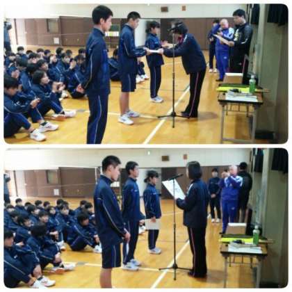 各優勝チームの体育係に学年主任の仲原先生から表彰状が授与されました。表彰状は、仲よく各クラスとも1枚づつ獲得しました。