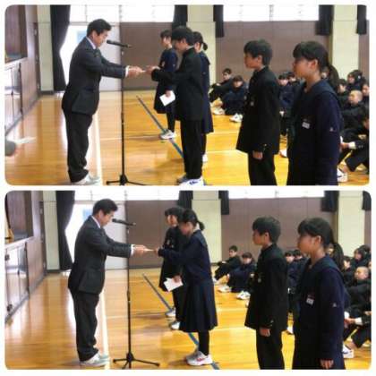 続いて、生徒会長の中森さん、男子副会長の押谷君、女子副会長の中林さん、男子書記の池田君、女子書記の合志さんに学校長から認証書が授与されました。