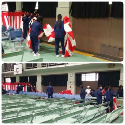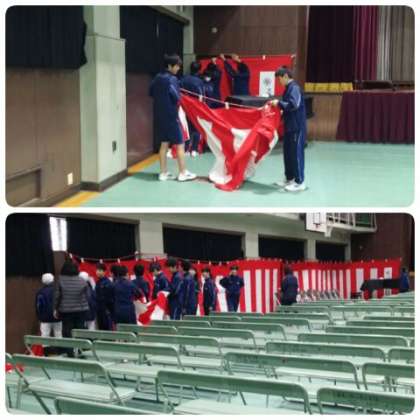 紅白幕の取り付けも終わり、準備完了です。手際よく作業に取り組んでくれ、予定より早く準備が終わりました。新2・3年生の皆さん、ありがとうございました。