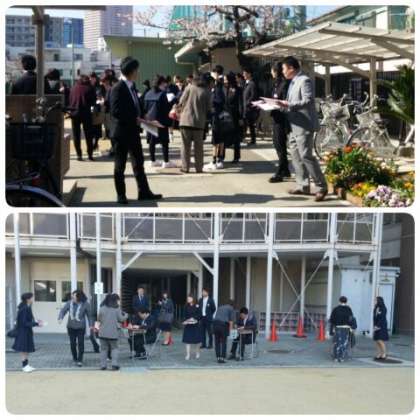 午前9時から、運動場で新入生の入学受付が始まりました。受付を終えた新入生は、自分のクラスのプラカードの前に集合です。