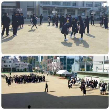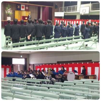体育館では、入学式に参列する在校生代表の新2・3年生と吹奏楽部員が国歌・市歌・校歌の最後の練習です。
