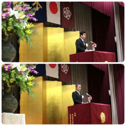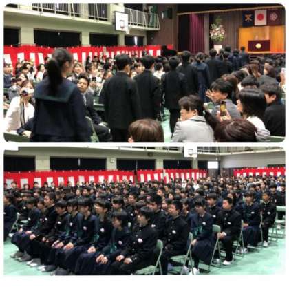 吹奏楽部の演奏による国歌斉唱、市歌斉唱に続いて、学校長式辞、PTA会長祝辞です。中学校生活に向けての激励の言葉がありました。
