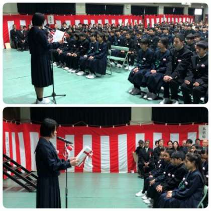 続いて、「新入生 誓いの言葉」です。新入生を代表して岩本さんから中学校生活のスタートにあたっての決意が述べられました。