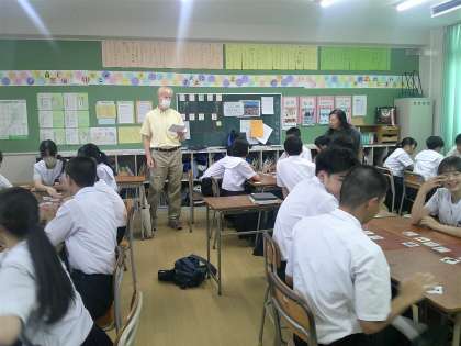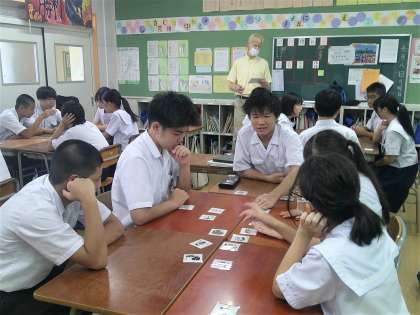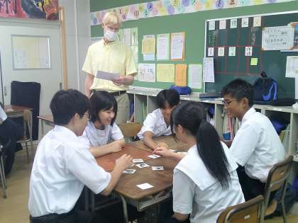 マーク先生が英語で読み上げた内容に関連するカードを見つけるゲームです。