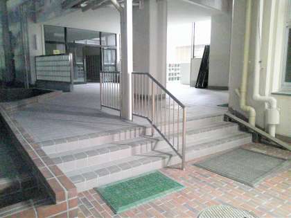 広くなった体育館への入り口で、保護者の皆さまをお待ちしています。