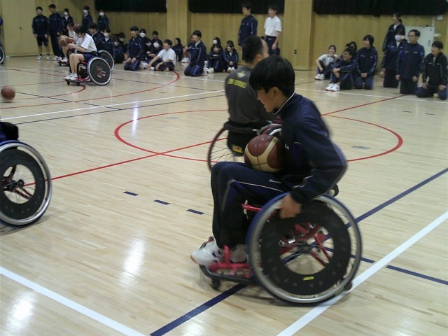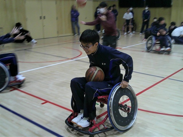 ルールを教えてもらってから、まずは競技用車いすに乗ってみました。