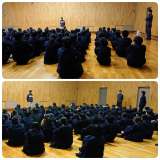 2月12日(水)5時間目、2年生は武道場で、修学旅行に向けての取組を行いました...