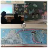 3年生学年展示の黒板アートです。修学旅行で行った高知県の県鳥「ヤイロチョウ」で...