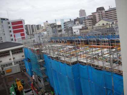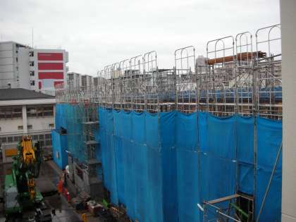 工事現場では、現在、2階部分の作業が続いています。2階の天井部分の作業を行うためには、足場は必然的に3階よりも高くなっています。