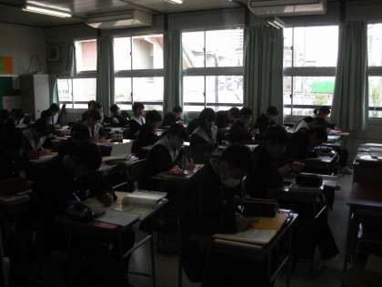 真ん中は1年2組の理科の授業です。先生が黒板に書かれた項目をノートにまとめていました。
