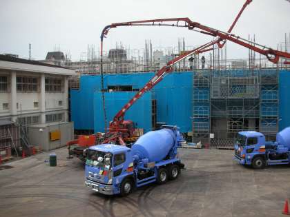 今日は、南館の2階部分にコンクリートを流す作業が行われます。大きな重機が2台入ってきました。