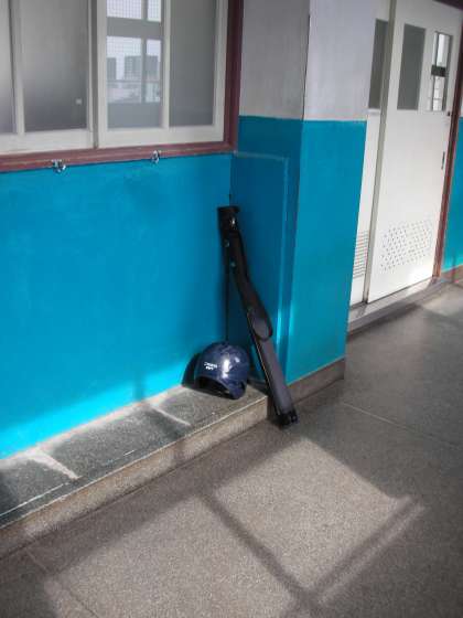 家に持ち帰ったバットとヘルメットを学校に持ってきたものです。他の人の迷惑がかからないように、教室の壁にもたれさせて保管されています。