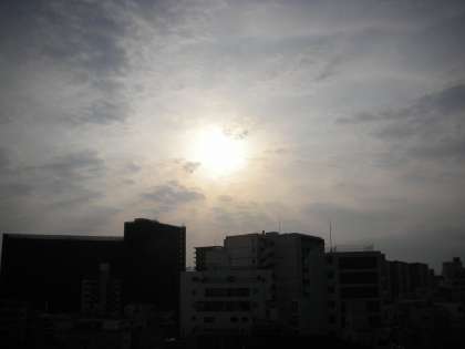 さて、西館屋上から見た東の空です。雲の間から日光が四方八方に降り注いでいます。雲が多く、曇天です。今日は、一日中曇り空の予報です。