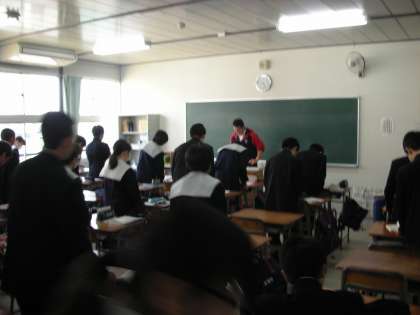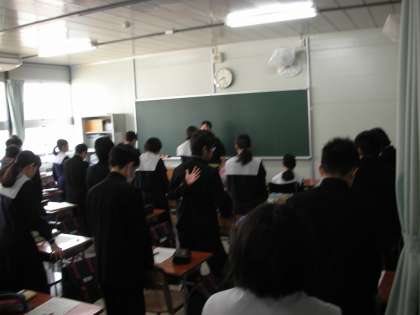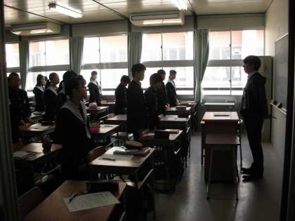 生徒と先生の挨拶から始まります。「お互いに今日も元気で頑張ろう!」