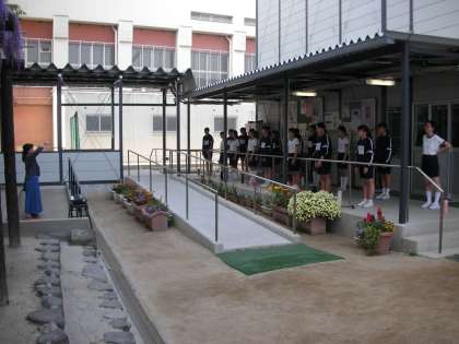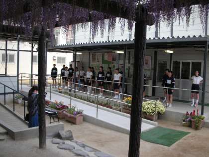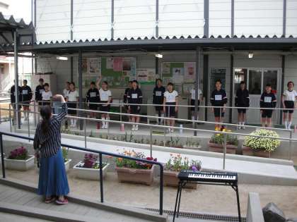 とても美しい歌声が職員室に飛び込んできました。外を見ると、音楽部が外で練習をしていたのです。いつもの練習場所である音楽室からでて、戸外での練習です。