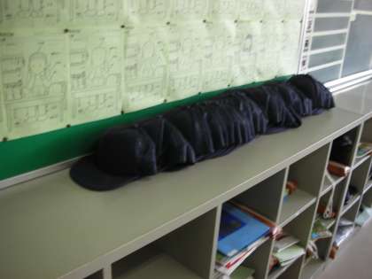 2年生の教室の後ろのロッカーを見ると、帽子がきれいに並んでいました。