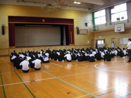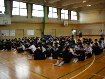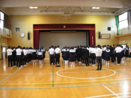 チャイムが鳴ったので、全員が起立して朝のあいさつをしています。