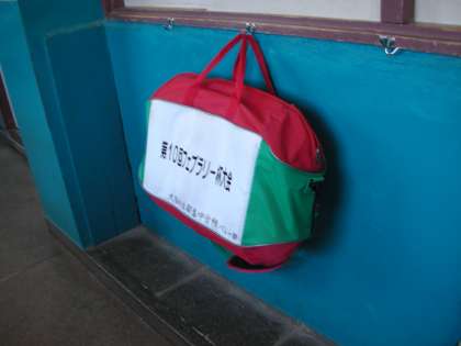 3年生の廊下を歩いていると、バレーボール部のボールケースが壁のフックにかけて保管されていました。