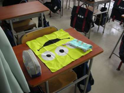 給食当番の人は、エプロンを着用し、三角巾とマスクを着けます。