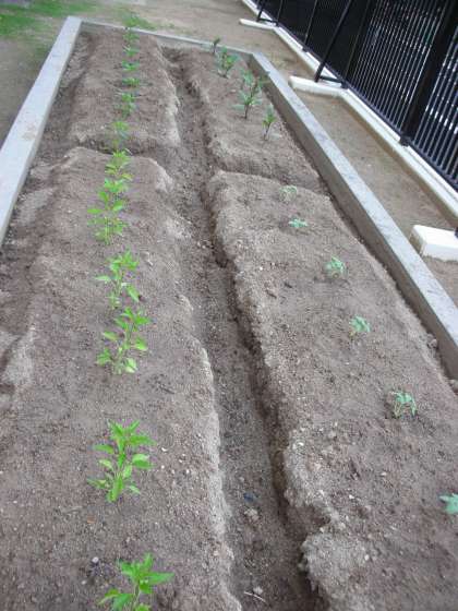 トマト、プチトマト、キュウリ、ピーマン、シシトウ、ナス、オクラが植えられました。