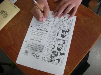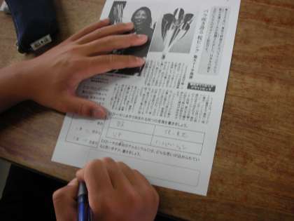 生徒たちは、配付された新聞記事を活用したプリントを読み、設問に答えています。