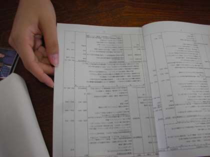 修学旅行のしおりが配布され、必要事項を記入しています。