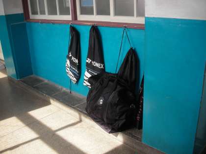 フックにテニスラケットと剣道の防具がきちんと保管されています。