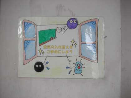 廊下の壁には、保健委員会作製の手作りの啓発ポスターが掲示されています。