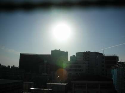 さて、西館4階から見た東の空の様子です。今日もまぶしい陽光が降り注いでいます。天気予報では最高気温が29度まで上昇するそうです。一日(朝と昼)の気温差が10度以上になります。気を付けて過ごしましょう。