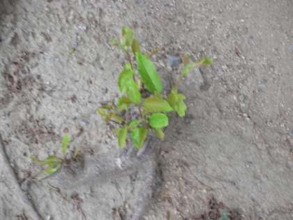 写真は、桜の木の根が地表面に出ているところです。さらにその表面から、サクラの新しい枝が出始めています。