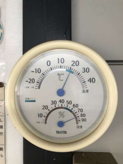 いつもの7時現在の温度計は、気温21度、湿度約80%を示しています。