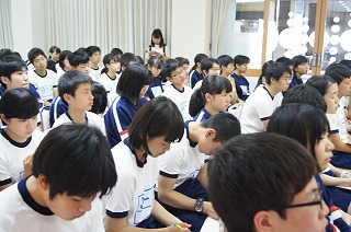 『100分の1秒の命』という演題のお話でした。森田さんは10歳の時に被爆しました。外から家の玄関に入った瞬間に、電気スパークのようなオレンジ色の光と爆風に包まれ、5mほど吹き飛ばされ、気を失ったそうです。家に入るのが『100分の1秒』遅かったら、自分の命はなかったとおっしゃいました。