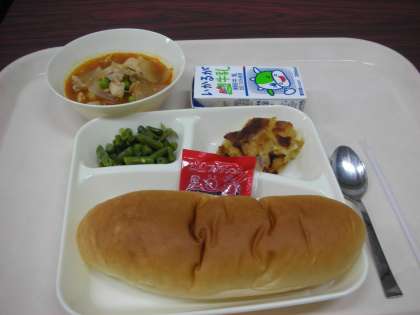 本日はケチャップ煮、インゲン豆のソテー、リンゴのクラフティー、コッペパン、イチゴジャム、牛乳でした。