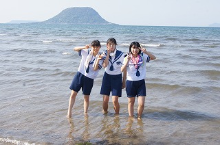 高島をバックにポーズ。