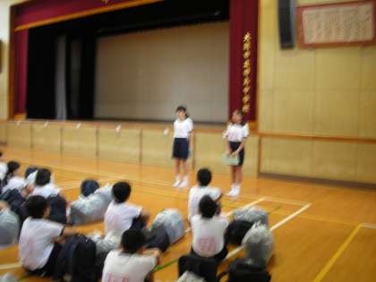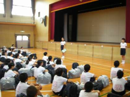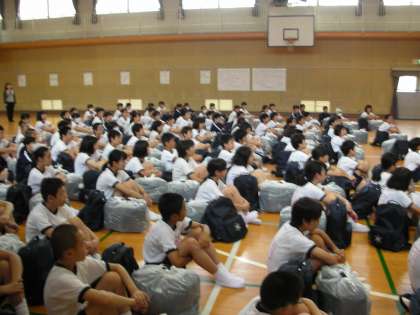 カバンが雨でぬれないように、各生徒が自分のカバンをビニール袋で包んでいます。