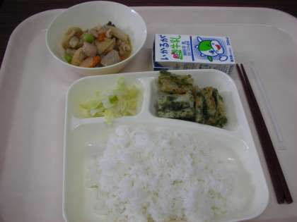 昨日の給食は、竹輪の磯部揚げ、鶏肉と一口がんもの煮物、あっさりキャベツ、米飯、牛乳でした。