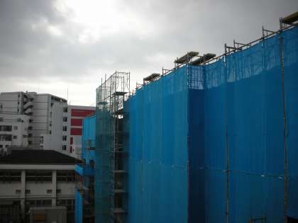 足場が4階よりもかなり高くなっています。屋上部分の仕上げ工事が行われているのでしょう。