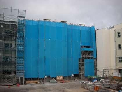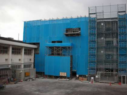 仮設校舎2階から見た南館工事現場です。4階部分には、先週の金曜日にコンクリートが流し込まれました。それを支える型枠が残っています。もうすぐ外されるのでしょう。