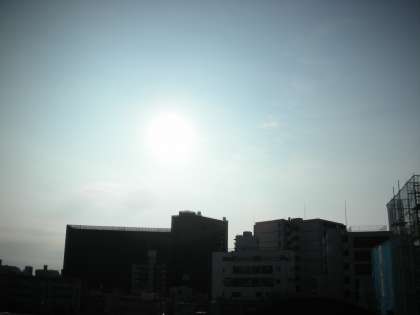 西館4階から見た東の空の様子です。まぶしい太陽がギラギラと大地を照り付けています。周りには薄い雲が漂っています。