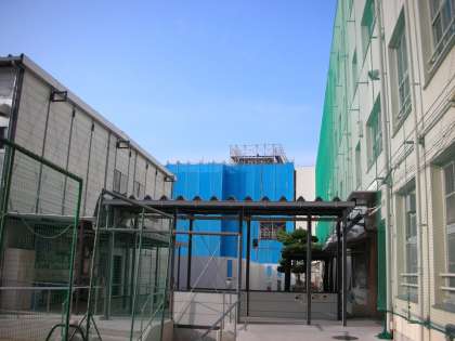 体育館前から南の方向を見たものです。右が西館、左が仮設校舎、そして真中が建設中の南館です。