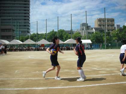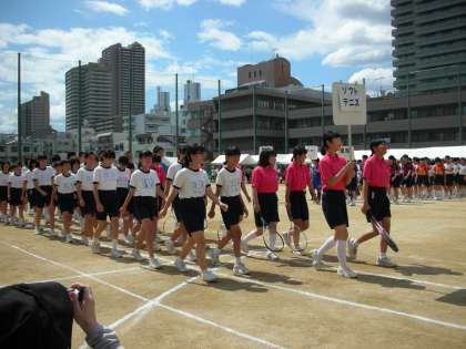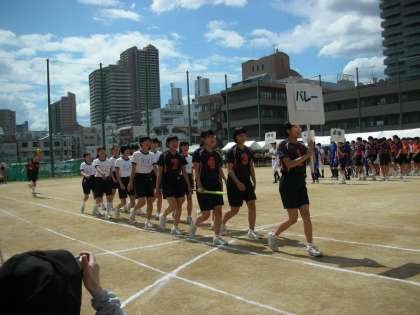 バレーボール部の入場です。クラブ編成時に1年生の入部が少なかったので、大々的に1年生の入部が期待されています。行進の最後部では、パス練習を披露しています。