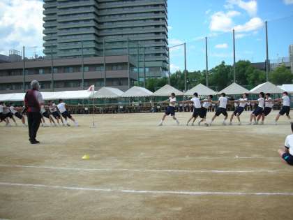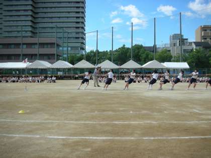 1本の綱にクラスの仲間の力を一つにして引っ張り合います。