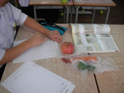1組は、美術室で美術の授業です。果物や野菜をデッサンしています。