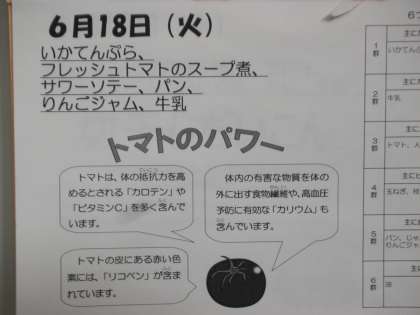 本日の給食は、イカの天ぷら、フレッシュトマトのスープ煮、サワーソテー、リンゴジャム、パン、牛乳でした。