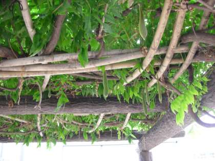 藤棚の写真です。 種子があちらこちらでぶら下がっています。 「大きくなーれ!」