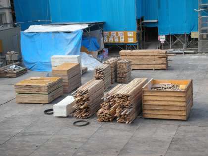 型枠の部材が、サイズごとに整理して置かれています。 南館の建物の中では、内装工事が進んでいます。