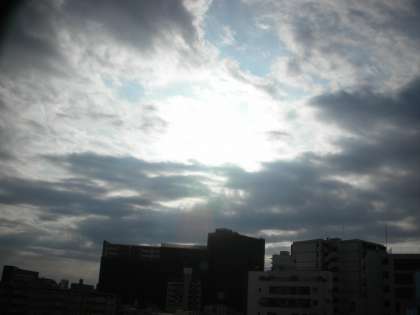 西館4階から見た東の空です。たくさんの雲が出ています。雲が流れ雲が切れたときに、まぶしい光が差し込んできます。