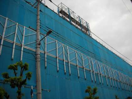 ご覧のように南館を覆うブルーシートも足場も全く大丈夫です。工事に影響がなくて「ホッ」としています。
